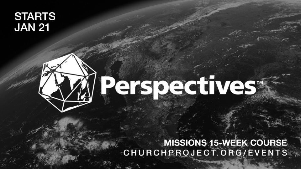 Perspectives is a fifteen-lesson education course exploring different aspects of God’s global purpose in a multi-faceted learning experience. The course examines the story of God fulfilling His promises from four vantage points or “perspectives” — Biblical, Historical, Cultural, and Strategic.