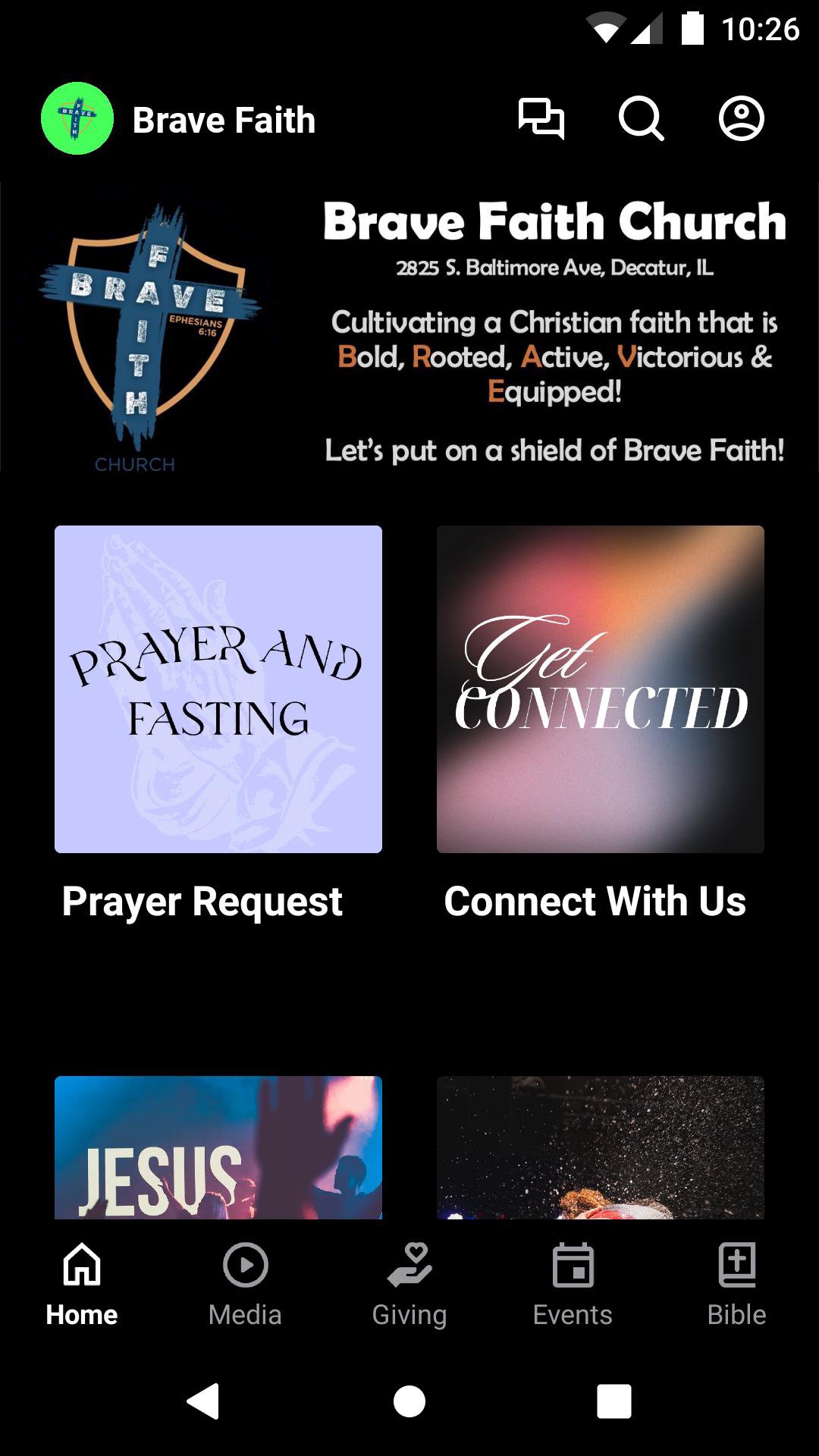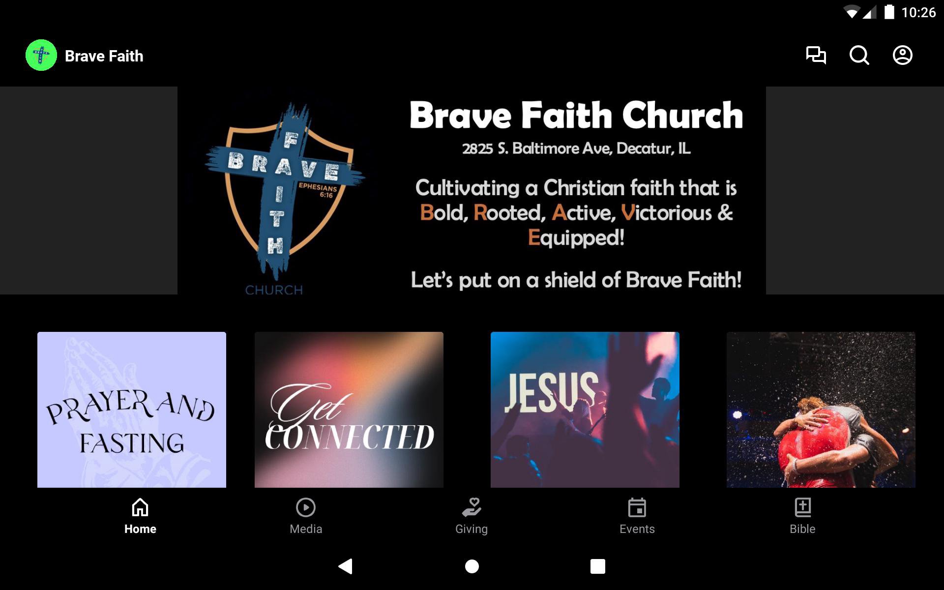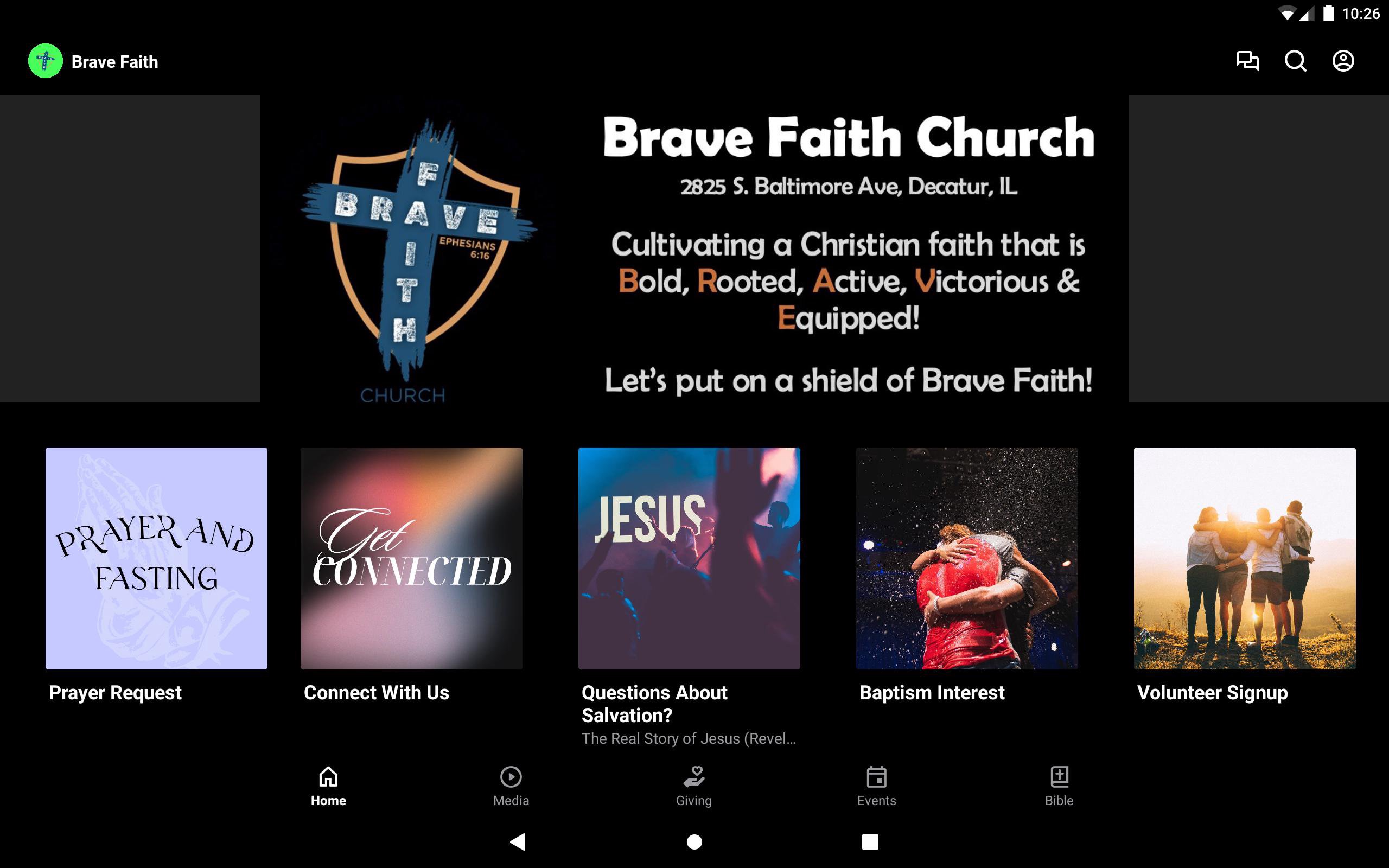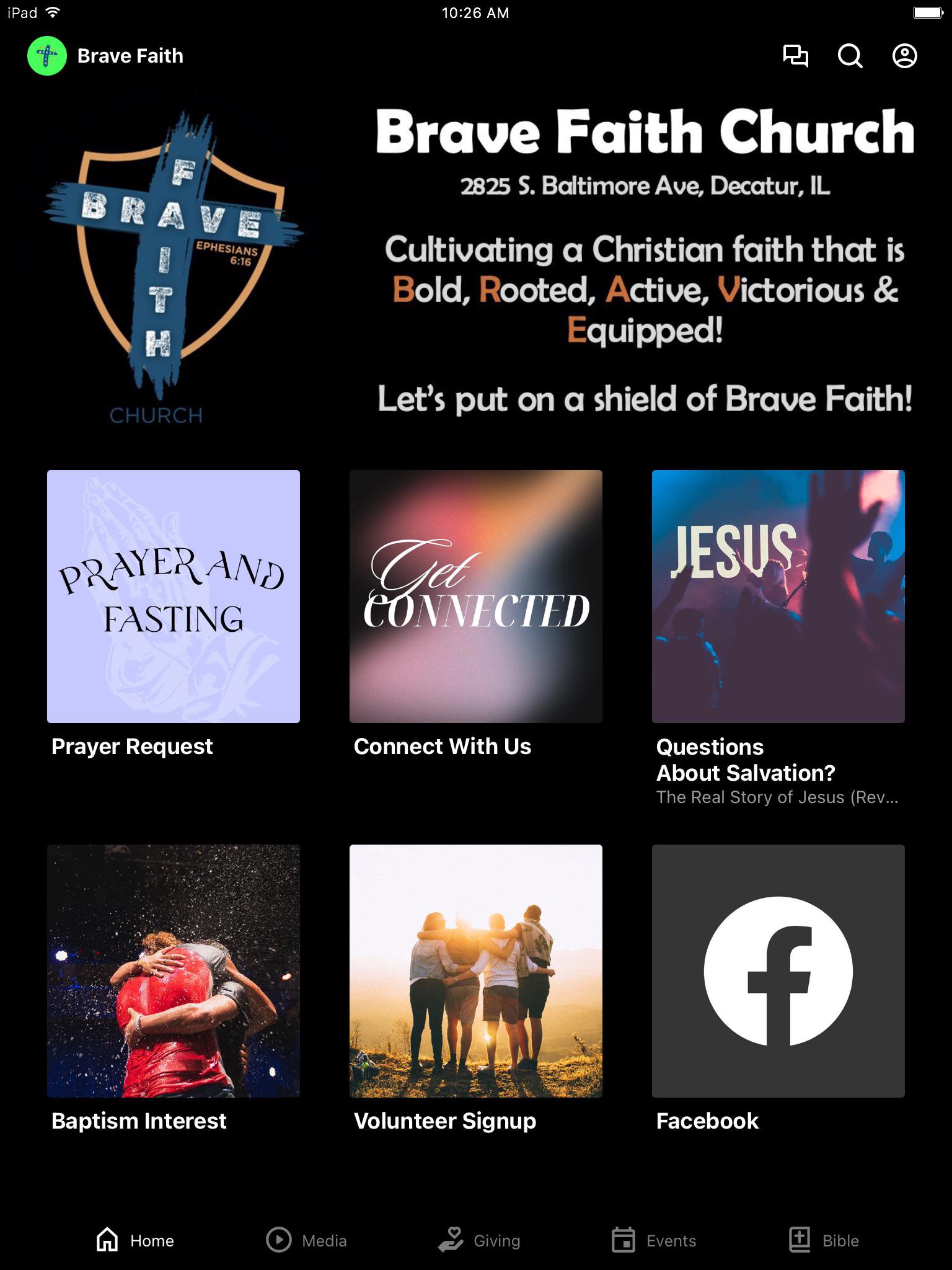 Welcome to the official mobile app for Brave Faith Church in Decatur, IL. With this app, you can access sermon video and audio (archives & live stream), give online, keep up with and register for upcoming events, download resources, and much more. Brave Faith Church is a caring, compassionate, and committed church desiring to make followers and disciples of Jesus Christ who are Brave in their faith, so we will be able to "hold up the shield of faith to stop the fiery arrows of the devil" (Eph 6:16, NLT). We desire to have a BRAVE Faith that is also an acronym that stands for a Bold faith, a Rooted faith, an Active faith, a Victorious faith, and an Equipped faith. This BRAVE Faith is built up through Bold preaching that is Rooted in God's Word, building Active followers of Jesus Christ who live the Victorious Christian life God intends, and Equipping us to be disciples and to disciple others. This Brave Faith helps us learn to live in a world that is opposed to anything and everything established and ordained by the one true God, through salvation available in Jesus Christ alone, and through the power of the Holy Spirit in our lives. We desire to commune with our Lord and Savior Jesus Christ on an ongoing and daily basis, by being immersed in God's Word through reading, studying, and teaching; through a continual attitude of and commitment to prayer; and with fellowship in the community of believers. May this app be one small tool to enable this desire to be Bold, Rooted, Active, Victorious, and Equipped in our faith! For more information, please visit BraveFaithChurch.com