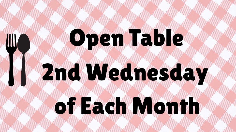 Share a meal with us on the second Wednesday of each month. Our Open Table free community meal is a way for everyone to share in food and fellowship. It is an opportunity for everyone to have a seat at the table and where no one eats alone.