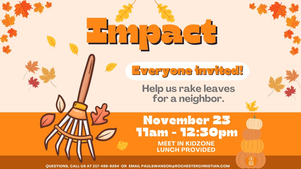 Everyone is invited to join us on November 23 from 11:00 AM to 12:30 PM for a special family service project. We will dedicate our time to doing yard work for one of our neighbors on Walnut Street, followed by lunch in Kidzone. Bring a rake and gloves.