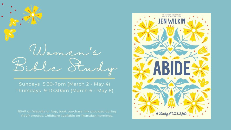 Join us for Jen Wilkin's Abide study, a ten-week journey through John's three epistles. Together, we'll dive deep into what John tells us about abiding in the truth, holding fast to what we know, and living like we believe it. We plan to offer two study times: