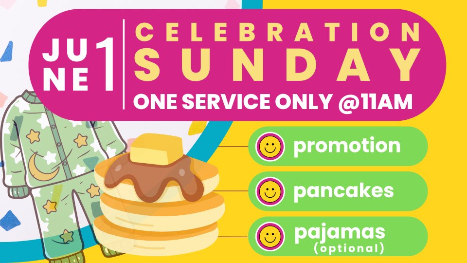 Join us for ONE SERVICE ONLY at 11am. We will have worship in the sanctuary at 11. You can tour of the children's area. The kiddos can take part in an scavenger hunt. There will be pancakes for all, and much more!!