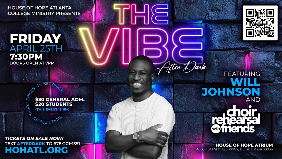 The House of Hope Atlanta College Ministry presents The VIBE After Dark. Featuring Will Johnson & Choir Rehearsal with Friends! Friday, April 25th in the House of Hope Atlanta Atrium. Doors open at 7PM. The show begins at 7:30PM. It is a SCHOLARSHIP FUNDRAISER to be awarded to three upcoming college students for the 2025 Fall Semester. Tickets are $30 General Admission/$20 Students. Concessions will be available for purchase.