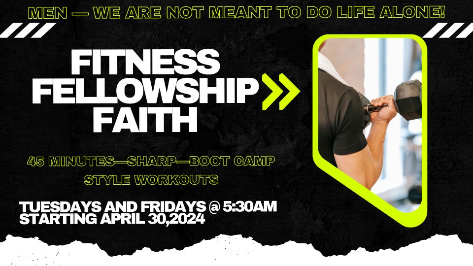 Men - we are NOT meant to do life alone. Come join a group of guys for a 45 min. (SHARP) peer led bootcamp style workout. You haven't been working out, that is OKAY - workouts are for all levels of fitness.