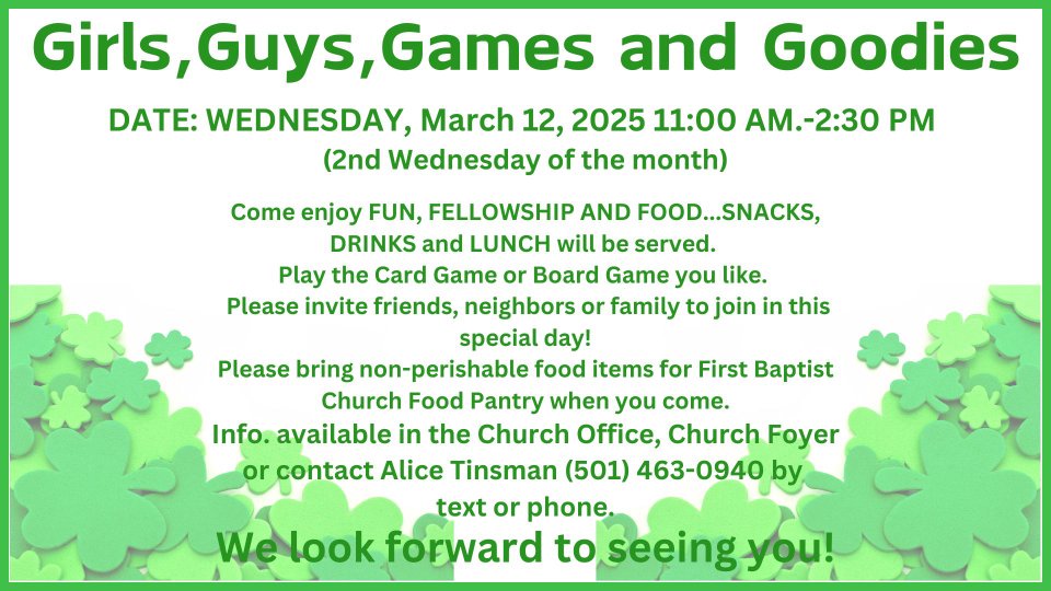 Please bring non-perishable food items for First Baptist Church Food Pantry when you come.