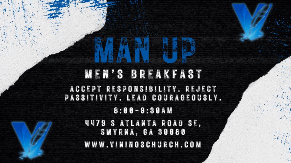 Calling all men!!! Join us on March 29th at Vinings Church as we seek Biblical manhood together. Accept responsibility, reject passivity, and lead courageously. We will meet from 8:00am-9:30am, breakfast will be provided. Register now, bring a friend and come hungry!