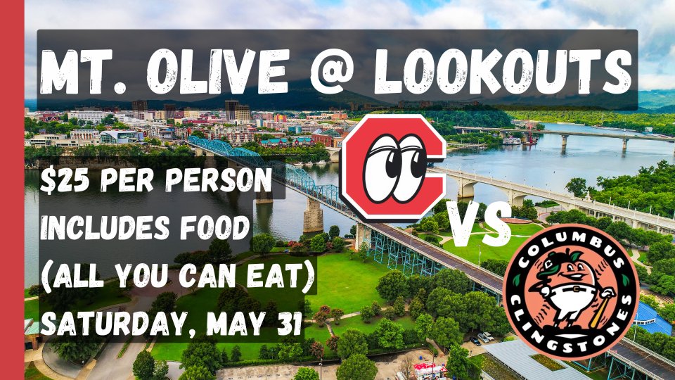 Mt. Olive is taking YOU out to the ballgame! Join us Saturday, May 31st at 7PM as the Chattanooga Lookouts take on the new Atlanta Braves affiliate, Columbus Clingstones! The game will be at AT&T field in Chattanooga and the price will be $25 per person which includes an all you can eat food selection! You won't want to miss this as it is the last year the Lookouts will play in this stadium! We hope to see you there!