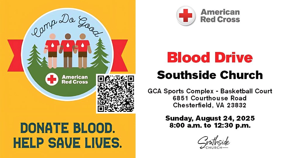 Please call 1-800-RED CROSS (1-800-733-2767) or visit RedCrossBlood.org and enter: SouthsideChurch to schedule an appointment.