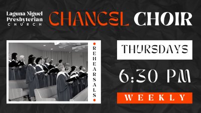 Laguna Niguel Presbyterian Church's Chancel Choir gathers weekly at 6:30 pm in the sanctuary for a transformative and enriching rehearsal led by the talented director, Lee Lee. This weekly musical gathering serves as a dedicated space for passionate singers within the congregation to come together in harmony. Under Lee Lee's expert guidance, the Chancel Choir delves into a diverse repertoire, encompassing traditional hymns, contemporary pieces, and perhaps even special arrangements tailored for upcoming worship services or events. The sanctuary resonates with the collective voices of choir members, creating a vibrant and inspiring atmosphere. The rehearsal is not only an opportunity to refine vocal techniques but also a time for spiritual connection and fellowship among choir members. Lee Lee fosters a collaborative and supportive environment, allowing each singer to contribute to the collective beauty of the music. Whether preparing for Sunday services, special events, or seasonal performances, the Chancel Choir rehearsal is a crucial cornerstone in the church's musical ministry. It is a space where the love of music, worship, and community intersect, making Thursday evenings a cherished time for all involved.