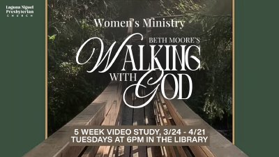 Beth Moore “Walking with God” Video Study Join Women’s Ministry for a 5-week video study of Walking with God by Beth Moore, Tuesday Evenings, beginning March 24 in the Library at 6PM. Each week we’ll watch a 45-minute teaching video together and grow in learning how to develop a deeper, more personal relationship with God. A companion workbook is optional and available for $20. Come be encouraged, strengthened in your faith, and connected with other women as we walk with God together.
