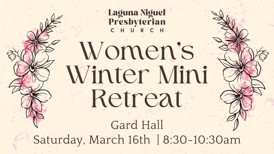 π You are cordially invited to the LNPC Womenβs Winter Mini Retreat, a relaxing and refreshing getaway! π¬οΈβοΈ ποΈ Saturday, March 16, 2024 π£ 8:30 AM - 10:30 AM π Gard Hall, Laguna Niguel Presbyterian Church Embrace the tranquil atmosphere as we embark on a morning of renewal and connection. π§ββοΈβ¨ Indulge in chair yoga and art, both led by Susie Hess, to soothe the body and mind, bring something to share for breakfast, and immerse yourself in uplifting music led by Lee Lee. ποΈ Special highlight: Rev. Dee Hazen will share an inspiring message, setting the tone for our journey of faith in 2024. πβοΈ This Womenβs Winter Mini Retreat is your opportunity to refresh, recharge, and connect with other incredible women on the same journey. πΊπ Mark your calendars and join us for a morning of warmth, inspiration, and community. We look forward to sharing this meaningful time with you! π