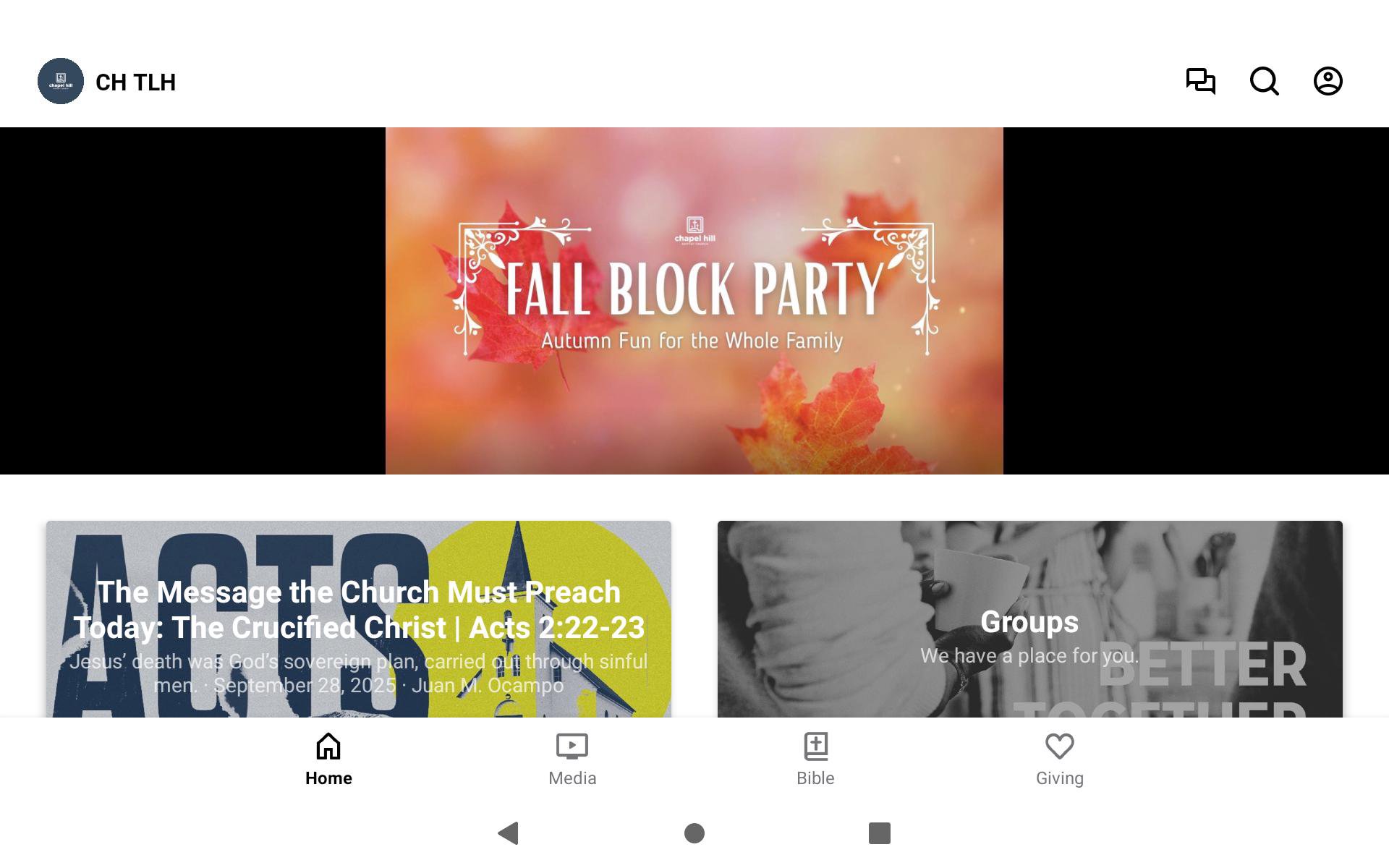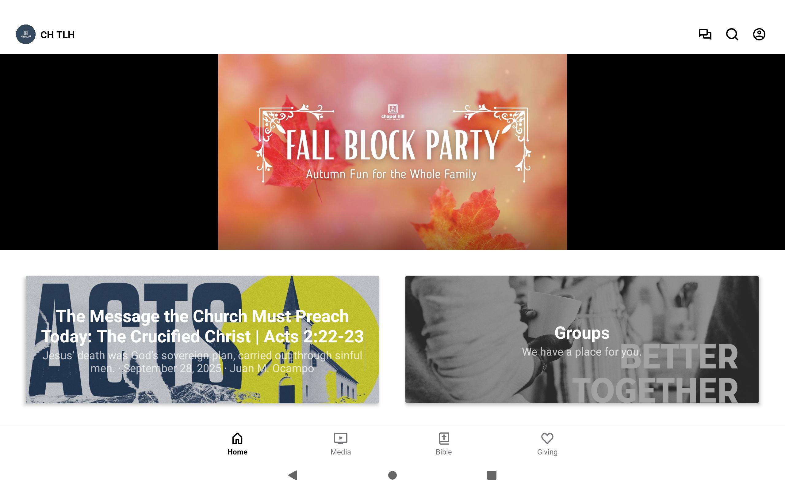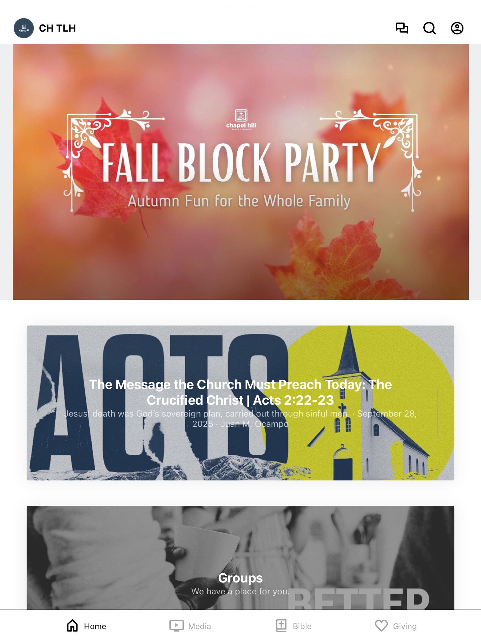 Welcome to the Chapel Hill Baptist Church app! Our mission is simple: Live by God's Word, Build each other up, and Move His Kingdom forward. Stay connected with the life of our church wherever you are. Watch sermons and livestreams, explore upcoming events, and access resources to help you grow in your walk with Christ. Through this app, you can: -Watch or listen to sermons anytime -Join our livestream worship services -Keep up with events and opportunities to connect -Read Scripture and study alongside our church family -Give securely and easily -Share resources with friends and family Download today and take Chapel Hill with you wherever you go!