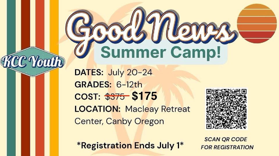 KCC Youth invites 6th - 12th grade students (incoming and recently graduated) to Foursquare PNW Summer Camp 2025! We will be joining other churches within our district for a time of fun, games, making new connections, worship, and encouragement through the message of "The Good News."