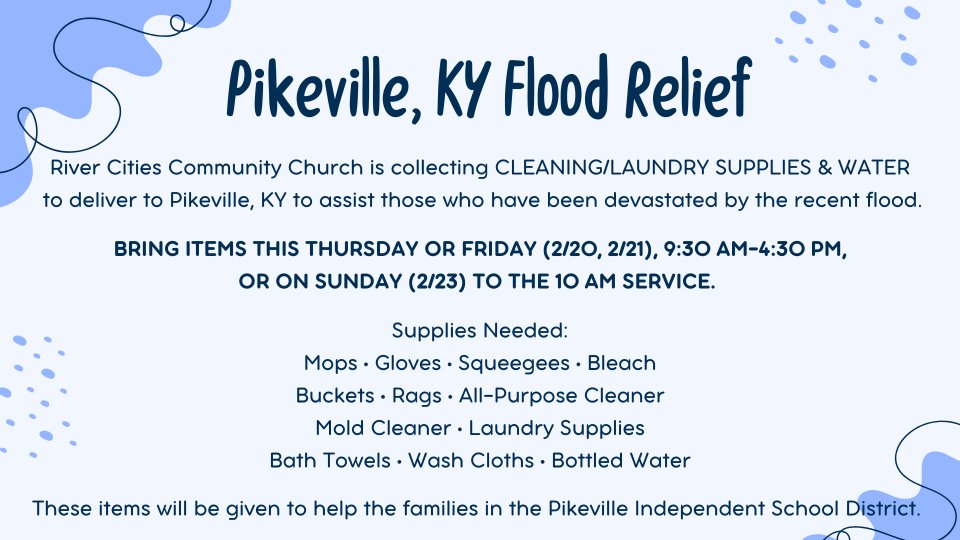 Our church is collecting CLEANING/LAUNDRY SUPPLIES & WATER to deliver to Pikeville, KY to assist those who’ve been devastated by the recent flooding.