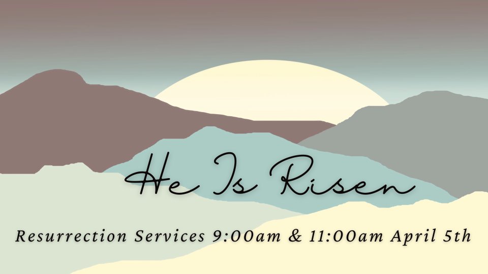 HE HAS RISEN! Join us as we celebrate the Resurrection of Our Lord and Savior! Invite your family, friends, and neighbors to celebrate with us. Services are at 9:00am & 11:00am.