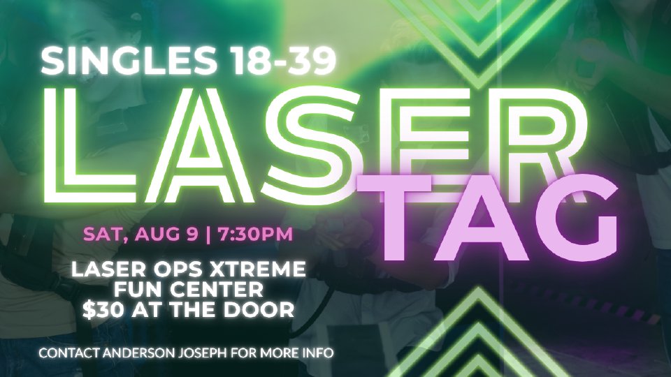 Singles ages 18-39! It’s that time of year again for some competitive fun and tons of laughter, as we head out to Xtreme Fun Center for laser tag! The fun begins Saturday, August 9 at 7:30pm at Laser OPs Xtreme Fun Center in Tampa. The cost is $30 per person at the door. Bring a friend and your A-game to this exciting event. This will be a night you won’t forget! For more information, please see Anderson Joseph.
