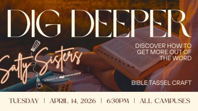 Join us for Salty Sisters: Digging Deeper on April 14 for a fun and meaningful night of fellowship, food, and growing in Godâs Word! The theme for the evening is âDigging Deeper into Scripture.â Our speaker will share practical encouragement on how to read the Bible, helpful Bible study tips, and ways to stay encouraged and consistent in Godâs Word. After the message, weâll create a Bible Tassel craftâa beautiful reminder to keep seeking and studying Scripture. Weâll also enjoy a Taco Bar dinner, so come hungry and ready for a great night together! Bring a friend and join us as we grow deeper in our faith and community. đ Date: April 14 đŽ Food: Taco Bar đ Theme: Digging Deeper into Scripture đ§ľ Craft: Bible Tassel