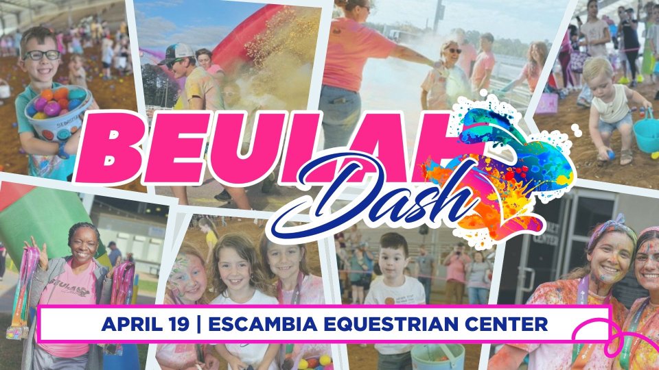 Join us for our annual Beulah Dash hosted by Marcus Pointe Baptist Church - Beulah. Bring the family to the Escambia County Equestrian Center Saturday April 19, 2025 for a family color run, food trucks, and free egg hunts for all ages and special needs.