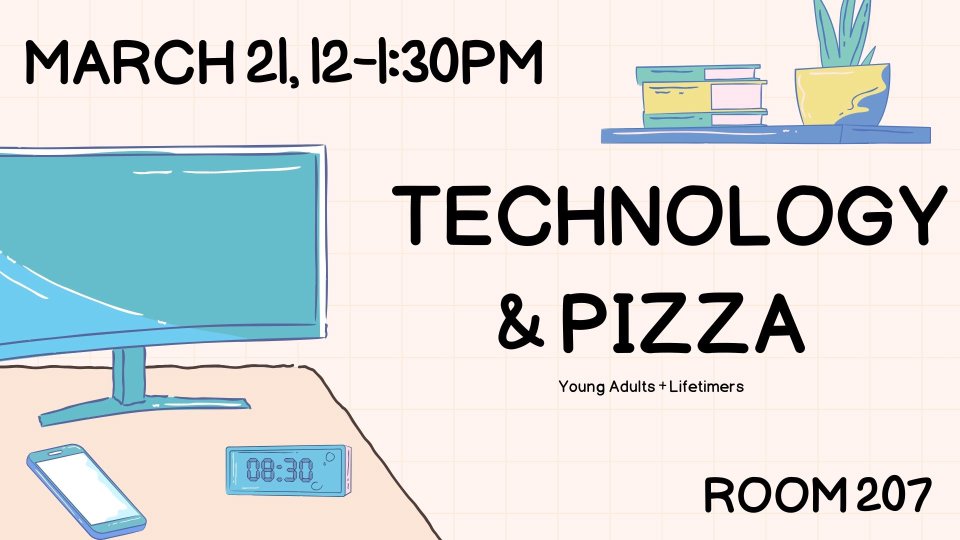 Lifetimers and Young Adults are invited to a pizza lunch at the church on March 21, from 12-1:30pm in room 207. We will focus on practical technology help. Young adults will assist Lifetimers with phones, tablets, and computers.