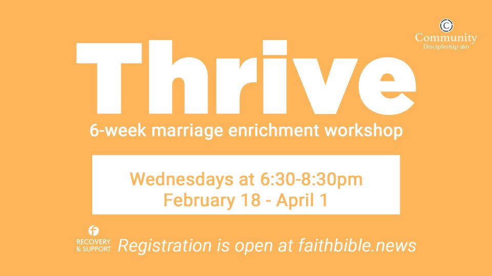 Join us for Thrive, a 6-week marriage enrichment workshop that helps couples grow strong, thriving marriages rooted in a shared vision and purpose, anchored in God's design. Topics will include the purpose of marriage, communication, intimacy, resilience, trust, and creating a lasting legacy together. Thrive will meet Wednesdays at 6:30-8:30pm, February 18-April 1. Registration is $20 and is now open!