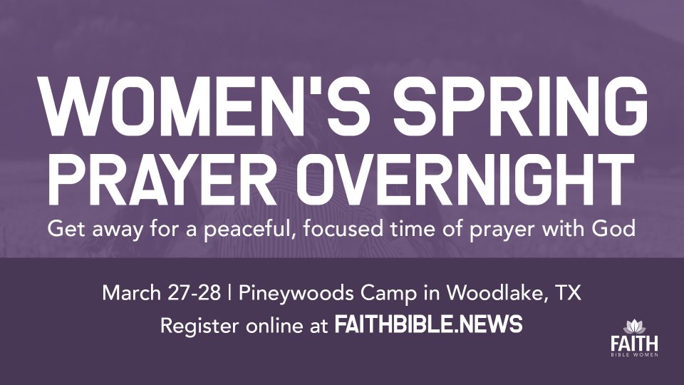 Faith Bible Women’s Ministry will have our Spring Prayer Overnight on March 27-28, at the beautiful Pineywoods Camp in Woodlake, TX. This is an opportunity to get away from your daily distractions for a peaceful, focused time of prayer with God. The cost is $40 and space is limited to 30 participants, so register online starting Feb 1st to join in this brief but powerfully refreshing time away. Contact Alisha Pish with any questions.
