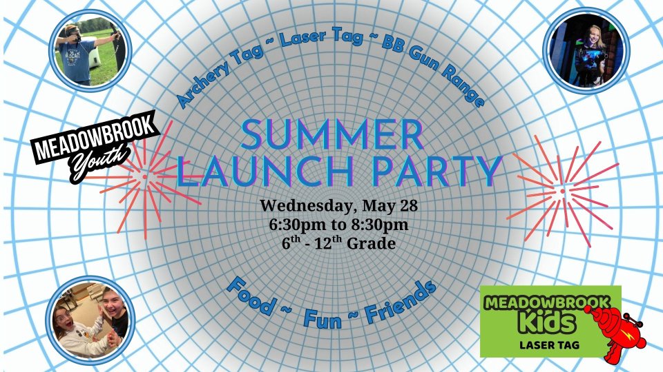 Summer is almost upon us & we want to kick off the season right. Whether you are a Meadowbrook Kid (K-5th grade) or Meadowbrook Youth (6th grade-Senior) make plans now to join us & invite all of your classmates, teammates & neighbors for a great time and LASER TAG! This annual tradition is sure to start off your summer the right way! Meadowbrook Kids meet from 6-8pm in the Student Center & Meadowbrook Youth 6-9pm in the foyer.