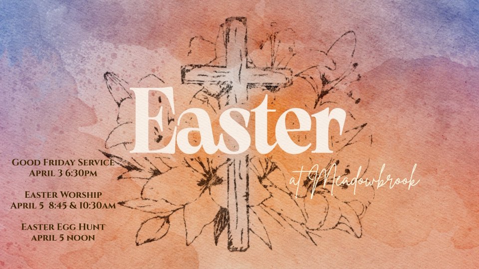 Come & celebrate our Risen Savior at Meadowbrook. We will begin with Good Friday Services on Friday evening at 6:30pm. Easter Sunday Worship will be held at 8:45 & 10:30 am. Immediately following the second service, we will head outside for our annual Easter Egg Hunt!