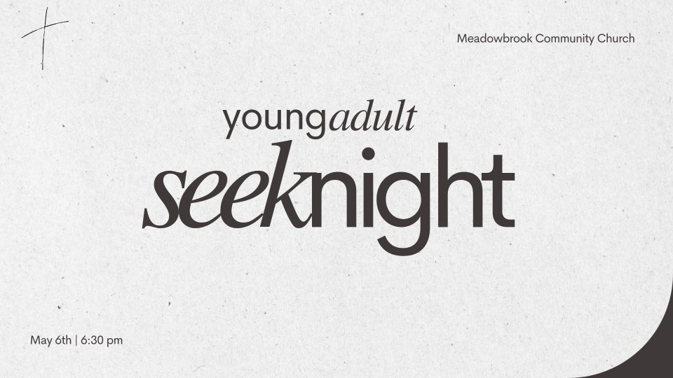Join us for Seek Night — a powerful worship night for young adults — on Tuesday, May 6th at 6:30 pm at Meadowbrook Community church! This will be a night to seek the Lord together with worship, some testimony, and a time of prayer for one another. As we seek we will find. Come expecting to encounter him in a fresh way. Bring a friend and let’s seek God together!