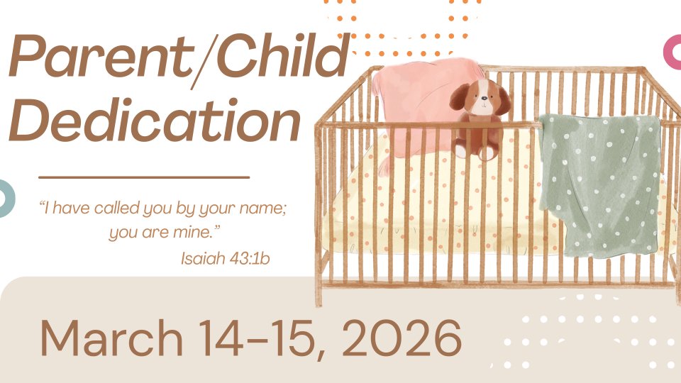 Join us for our Parent/Child Dedication Weekend March 14-15, 2026! On Saturday evening, we will gather for a meal together, and on Sunday, we will hold a dedication service during both morning services.