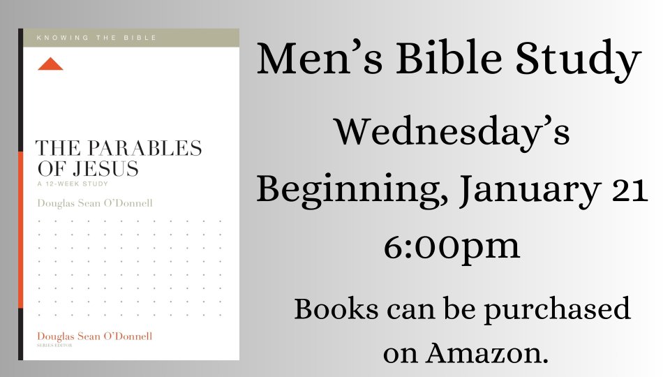 Join us as we explore for 12-weeks, "The Parables of Jesus" by Doug Sean O'Donnell and discover how they fit into the storyline of Scripture. The study will begin on Wednesday, January 21 at 6:00pm. Books can be purchased on Amazon.