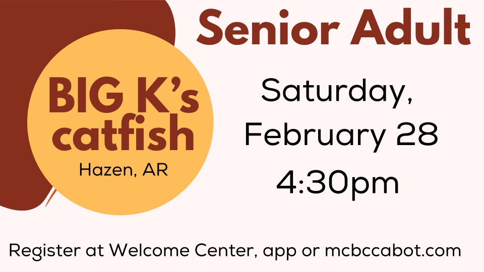 All adults 55 and over are invited to enjoy a fun evening out at Big K's Catfish in Hazen, Arkansas on Saturday, February 28. We will leave the church at 4:30pm. The cost is $25 per person. Pay cash or check only at the door.