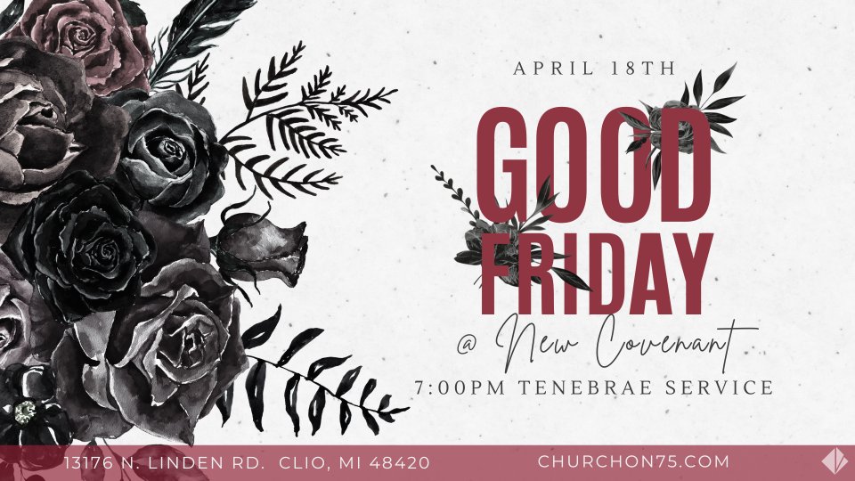 Join us for a solemn and reflective Good Friday service at New Covenant Church. Together, we will honor the sacrifice of Jesus on the cross, taking time for worship, communion, and prayer. All are welcome as we come together to remember the One who gave His life for us.