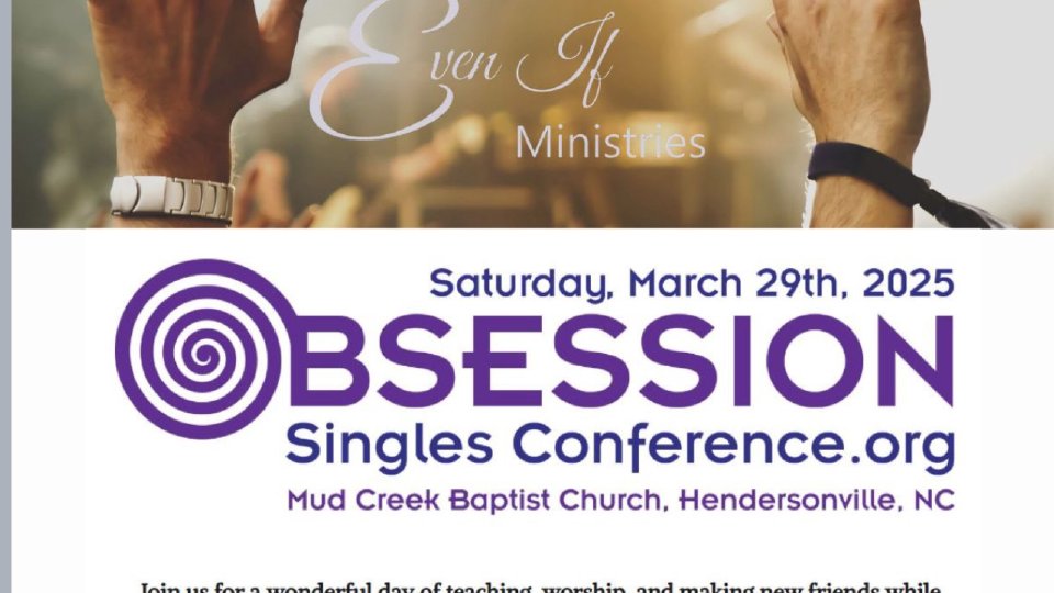 Saturday, March 29th in Hendersonville, NC, Even If Singles will be attending Obessions Christian Singles Conference @ Mud Creek Baptist Church. Make plans to carpool with other singles or drive yourself and meet us up at the conference. Doors open at 9:30 am, Conference starts at 10am. After the conference, we will check out downtown Hendersonville and grab dinner. This is a great opportunity to meet and worship with other singles from Western NC and Upstate SC. Contact Dr. Kim Edwards for more info.