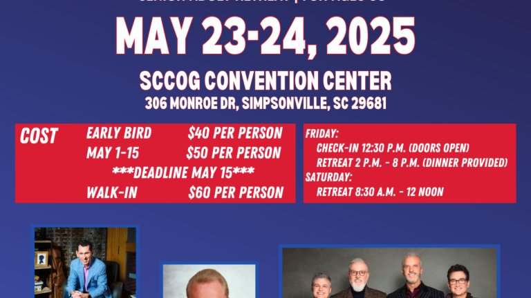 South Carolina Church of God is hosting our annual Palmetto Gathering and everyone 50 years of age and over is invited to attend. Special guests include Tim Lovelace, Bishop Tim Hill, and the Triumphant Quartet.