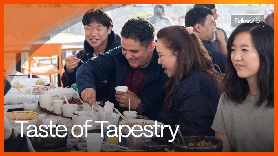 Looking for a fun way to meet some great people and share a meal? Taste of Tapestry is our monthly lunch hangout that happens right after 2nd service and you’re totally invited! Whether you're brand new, a familiar face, or somewhere in between, we’d love to spend some time with you.