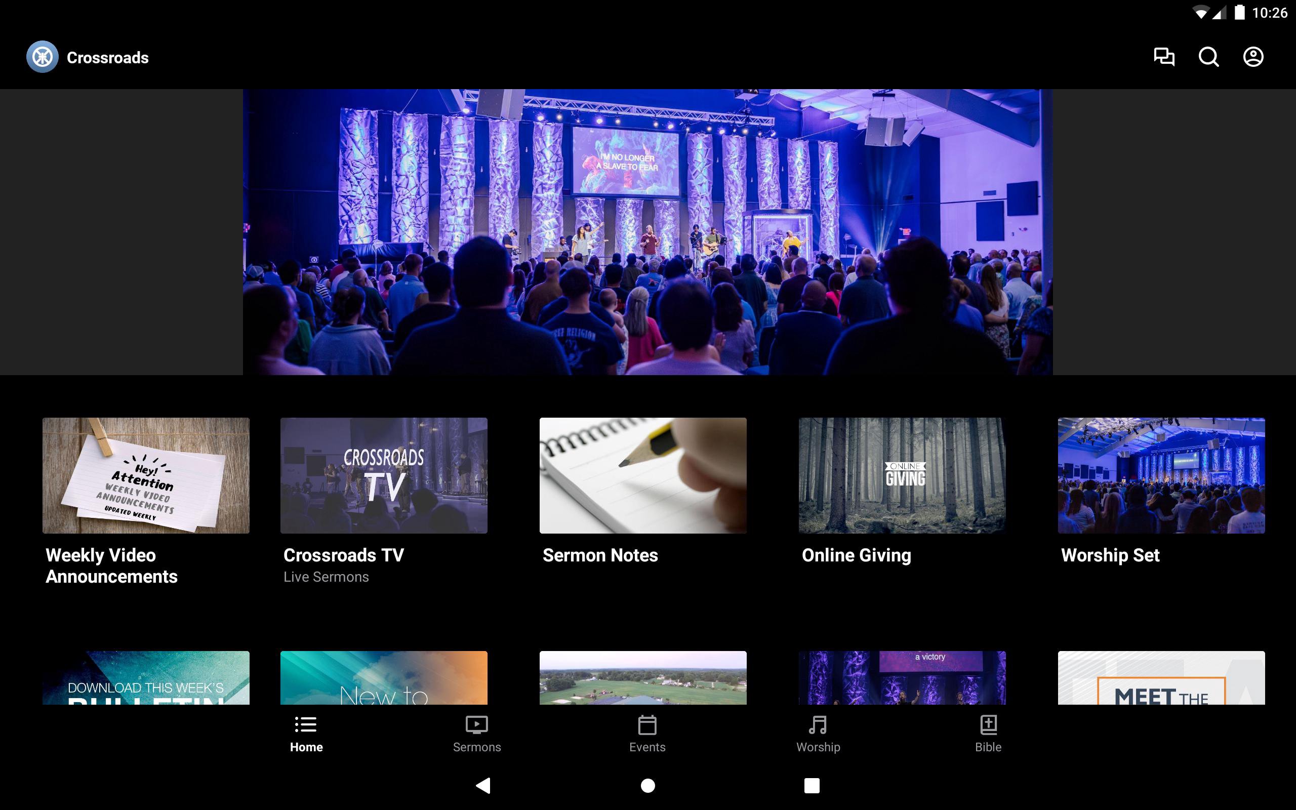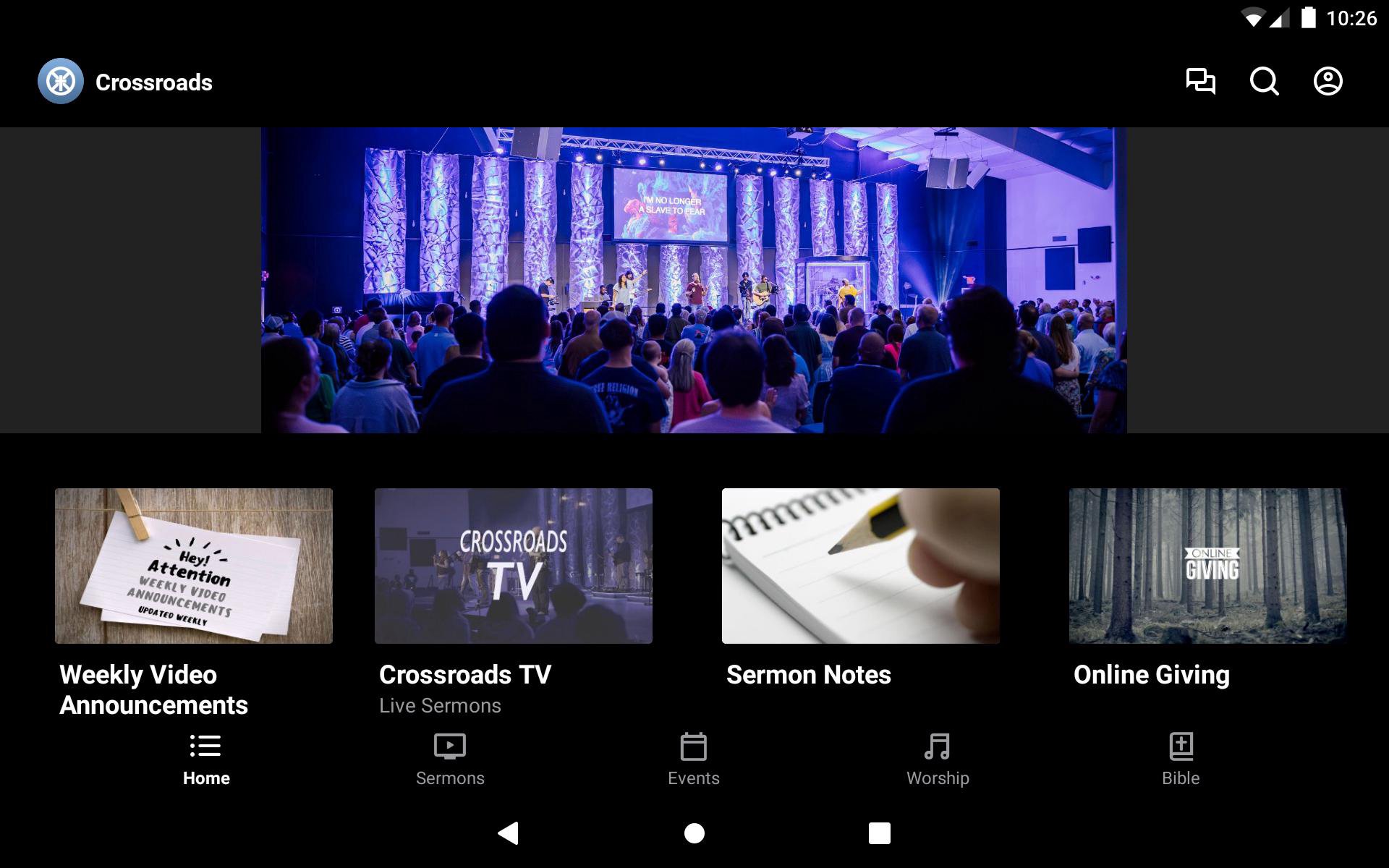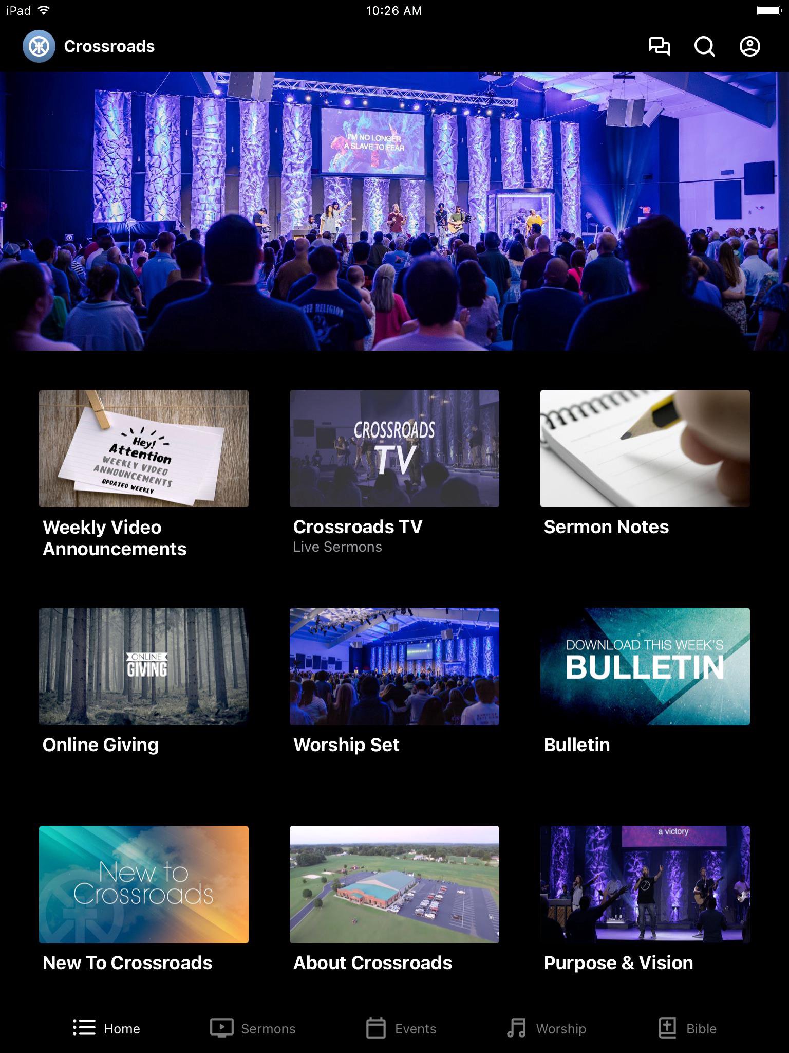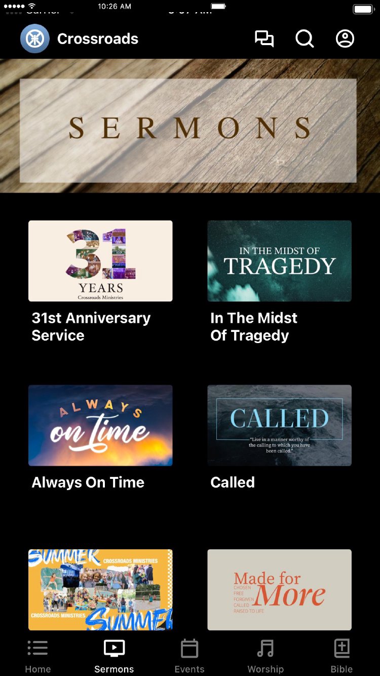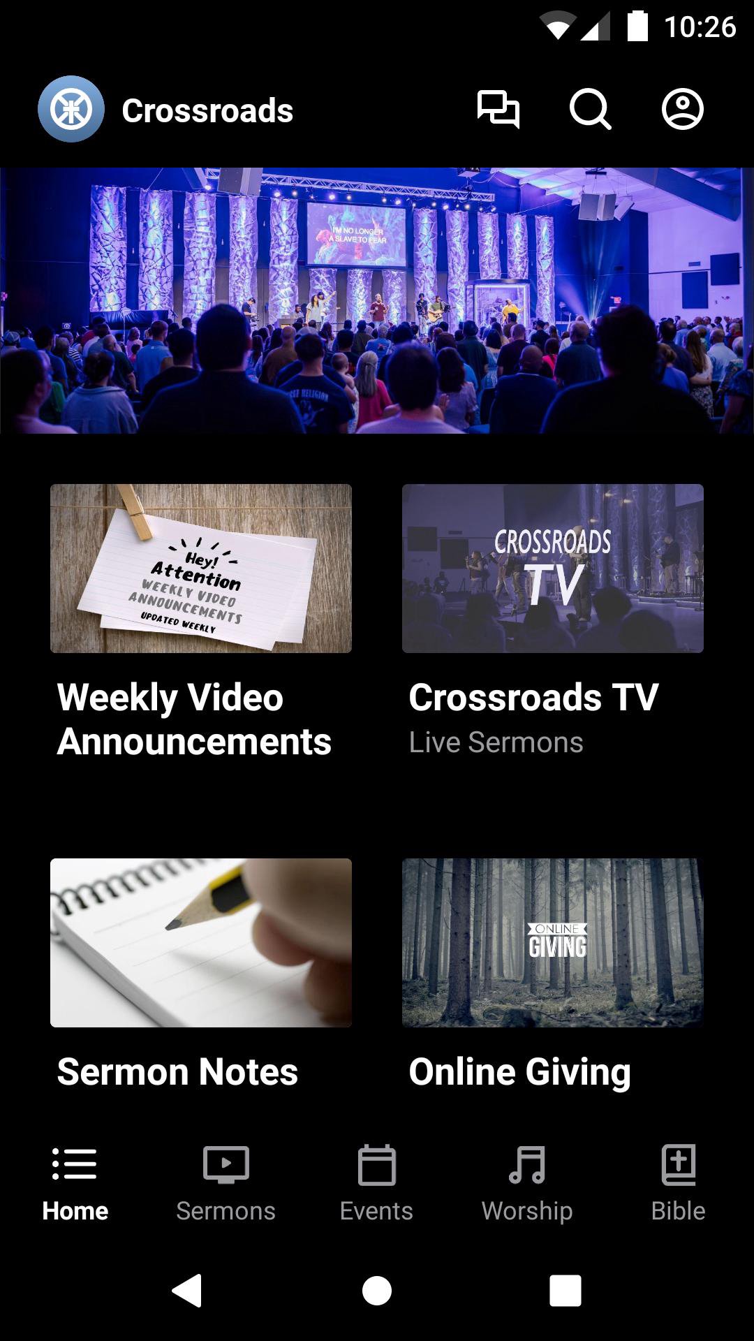 The Crossroads Ministries app gives you easy access to content, events, sermons, and information about Crossroads. The Crossroads Ministries App was created with the Subsplash App Platform.
