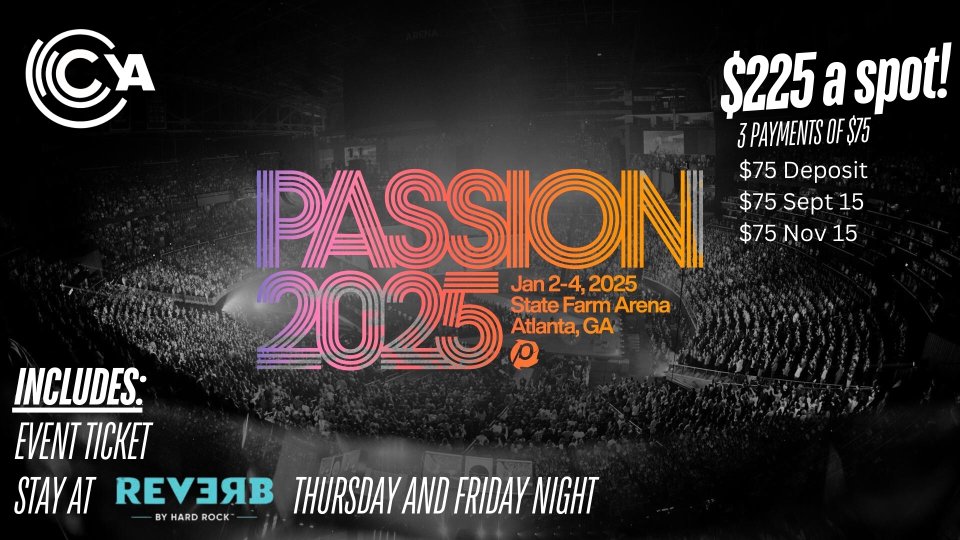 Young Adults & High School Seniors (Ages 18-25), join us January 2-4, 2025 at State Farm Arena in Atlanta for Passion 2025. The cost is $225 per person and includes your event ticket and hotel room for Thursday night and Friday night. Your $75 deposit is due upon registration to reserve your spot. Two additional payments of $75 will be due September 15 and November 15.