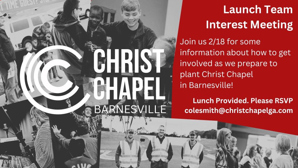If you would like to be a part of our launch team in Barnesville join us on 2/18 in the youth room at 1:00pm in our Zebulon Location. Pastor Cole will be going into more detail about how you can help. Lunch will be provided so please register for the event. We can't wait for you to help us reach Lamar County.