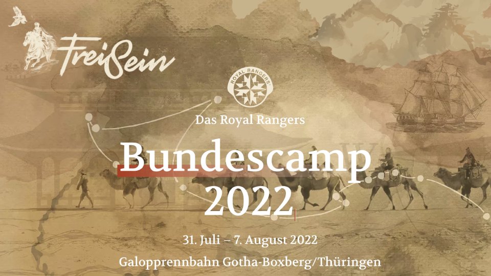 Das Bundescamp 2022 der Royal Rangers steht unter dem Motto "FreiSein" und findet auf der ehemaligen Galopprennbahn Gotha-Boxberg in Thüringen statt. Mehr Infos findet ihr unter www.bundescamp.de.