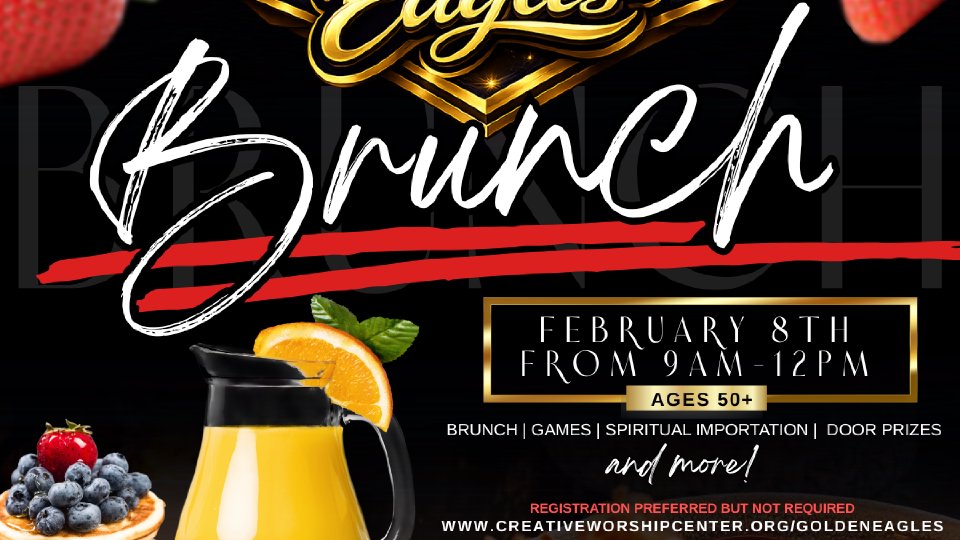 Join CWC g"Golden Eagles" (those 50ish and over) for a time of impartation, fellowship, food, games, giveaways, and much more! All are welcomed, and registration is encouraged! Please feel free to invite others. Space is limited. We will have brunch and an opportunity to gather around community.