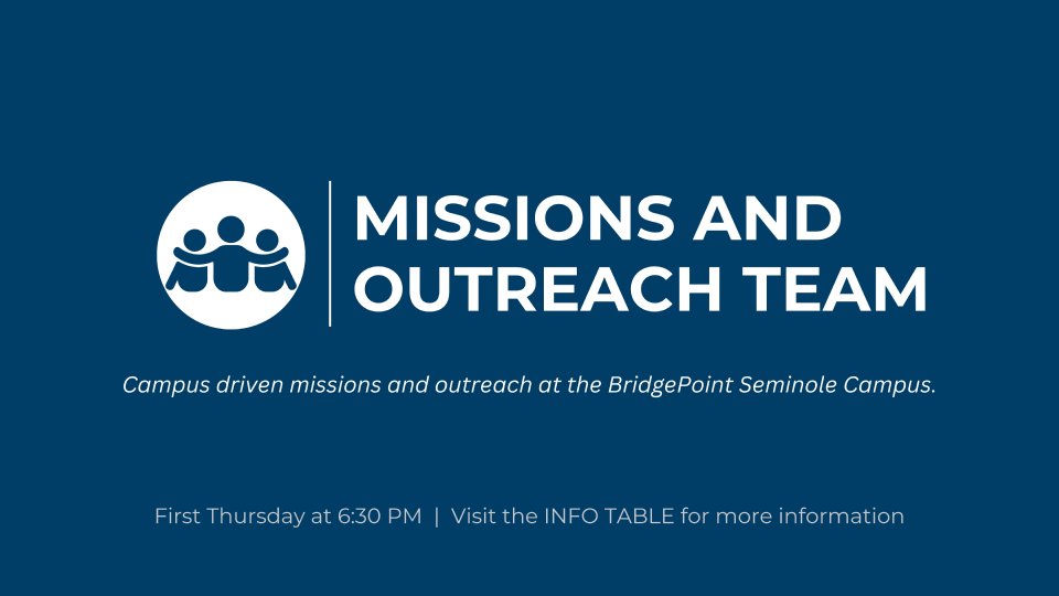 Become a part of the volunteer-driven Missions and Outreach Team to energize BridgePoint's mission at the Seminole campus. This team fosters and nurtures campus relationships with key local partners, represents BridgePoint Church in the community through outreach initiatives, and advocates for missions and outreach opportunities on the Seminole campus. Everyone is welcome to participate and contribute to sustaining BridgePoint's mission in all its endeavors.
