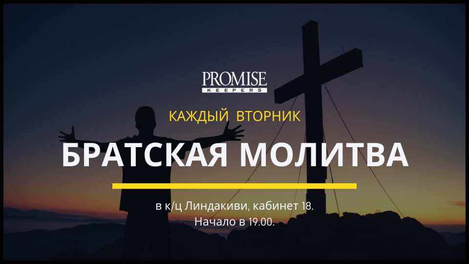 Дорогой брат! Приглашаем тебя принять участие в молитвенных собраниях организованных специально для мужчин. Мы встречаемся, чтобы поднять молитвы за наши нужды, наши семьи и стоять в проломе за нашу землю. Также мы хорошо проводим время в общении за чашкой чая с пиченьками. Братская молитва проходит каждый вторник по адресу J. Koorti 22, Tallinn, в к/ц Линдакиви, кабинет 18. Начало в 19.00. Добро пожаловать!