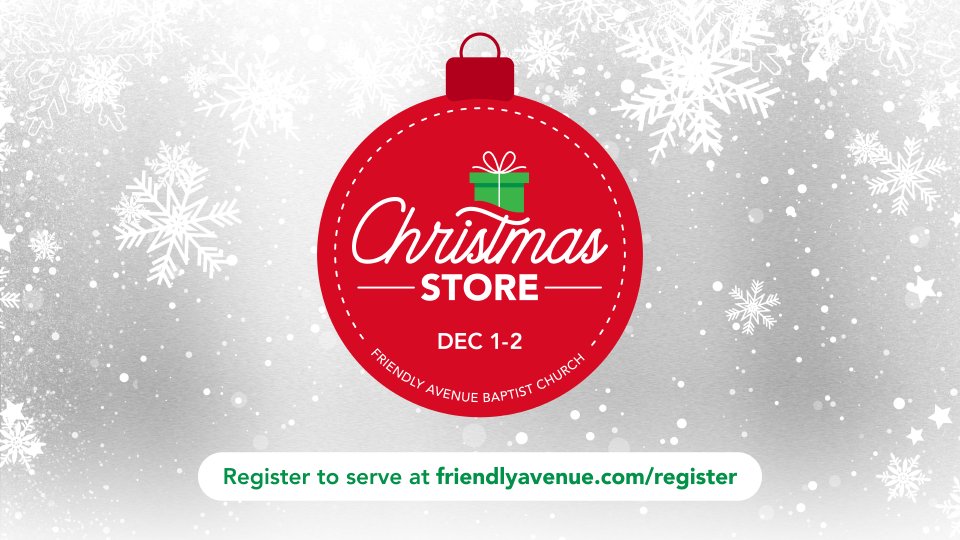 Join us for Friendly Avenue’s 6th annual Christmas Store. Our goal is to serve families in our community by providing Christmas gifts for their children, but also sharing with them the Good News of the season. The Christmas Store will be held on Friday, December 1st (5-8pm) and Saturday, December 2nd (9am-3pm). Please complete the form to join our team of volunteers in making this ministry possible. Contact ChristmasStore@friendlyavenue.com with any questions.