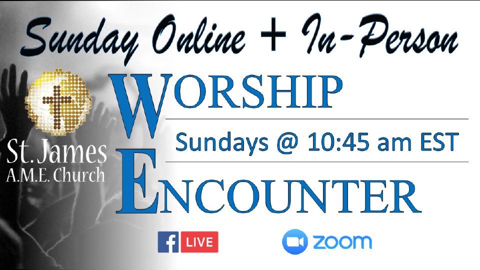 Join us ONLINE or IN-PERSON as we worship the Lord in spirit and truth. ZOOM: Meeting ID: 815 5398 0911 Password: 372 121 (346) 248-7799 or (669) 900-6833 FACEBOOK: www.facebook.com/stjamesamepittsburgh/