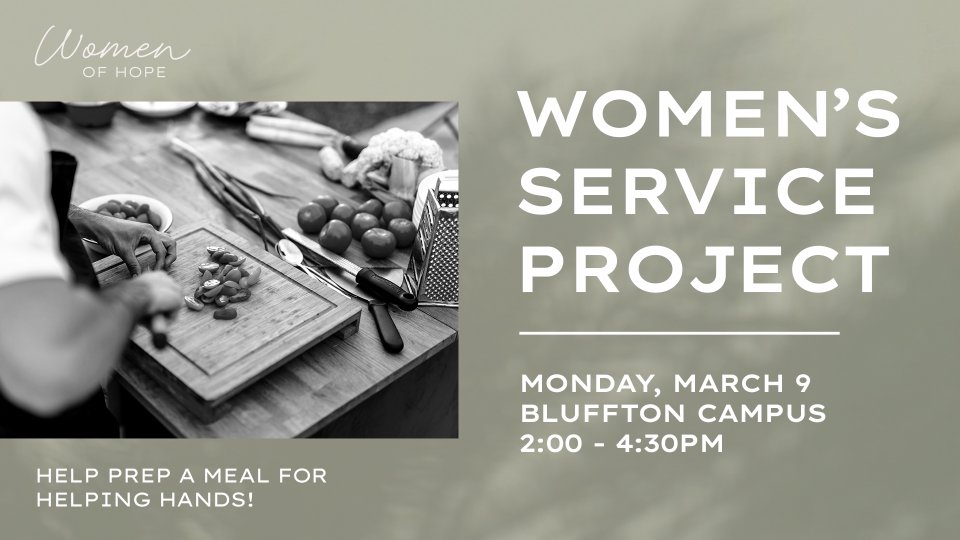 Women of Hope: Help us prepare dinner for the Helping Hands Framework of Parenting Program! We will gather on Monday, March 9 at 2:00pm in the Bluffton Campus Fellowship Hall to prepare a full meal. Limited spots available. Click below to sign up!
