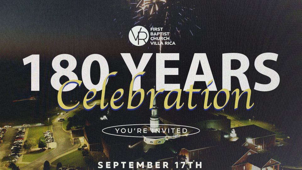 Join us for our Church-wide Family Day on September 17 as we celebrate the 180 Year Anniversary of Villa Rica First Baptist. At 9:00am, we will have one Special Anniversary Service as we reflect on the 180 year anniversary of the church and as we celebrate Dr. Kevin Williams' 10 year anniversary as Senior Pastor. There will be no Life Groups. At 10:15am, we will take a large group photo in front of the Welcome Center. At 6:00pm we will begin our evening celebration with food trucks, fellowship, and fireworks. We can't wait to share this momentous day with you and your family.
