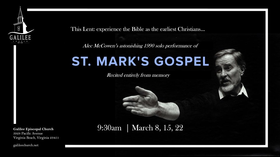 Come and watch the Gospel of Mark presented by Alec McCowen from memory. All sixteen chapters memorized over sixteen months.