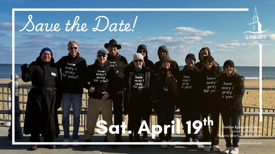If you can make it, we'd love to put you down for Saturday, April 19. Call, text, or email John Clunan (703-929-3659), who is now the point person at Galilee john@marieandjohn.com or Marie (757-955-7759) mariekirkclunan@gmail.com, who will stay involved in the Boardwalk ministry while serving as the Episcopal Co-pastor at Church of the Holy Apostles in Virginia Beach.