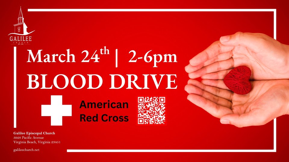 Galilee is hosting an American Red Cross Blood Drive on Tues., March 24th, from 2-6pm. We need four GREETERS to help facilitate the Blood Drive, AND we need DONORS to donate blood. Please register accordingly: