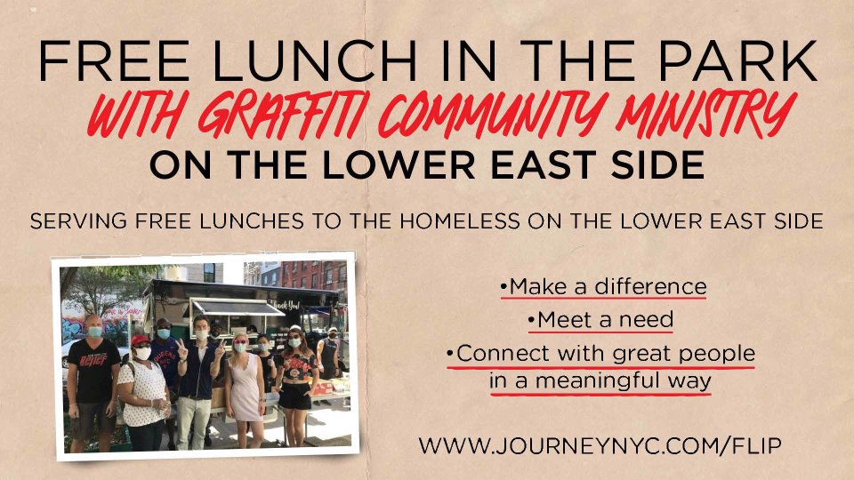 Join your friends from The Journey and make a difference by putting together and handing out FREE LUNCHES for the less fortunate on the Lower East Side on Saturday from 12:00pm-1:30pm. We’ll meet at East 7th Street Baptist Church at 205 East 7th Street – between Avenues B & C (closest subways are Union Square and the F at Astor Place).